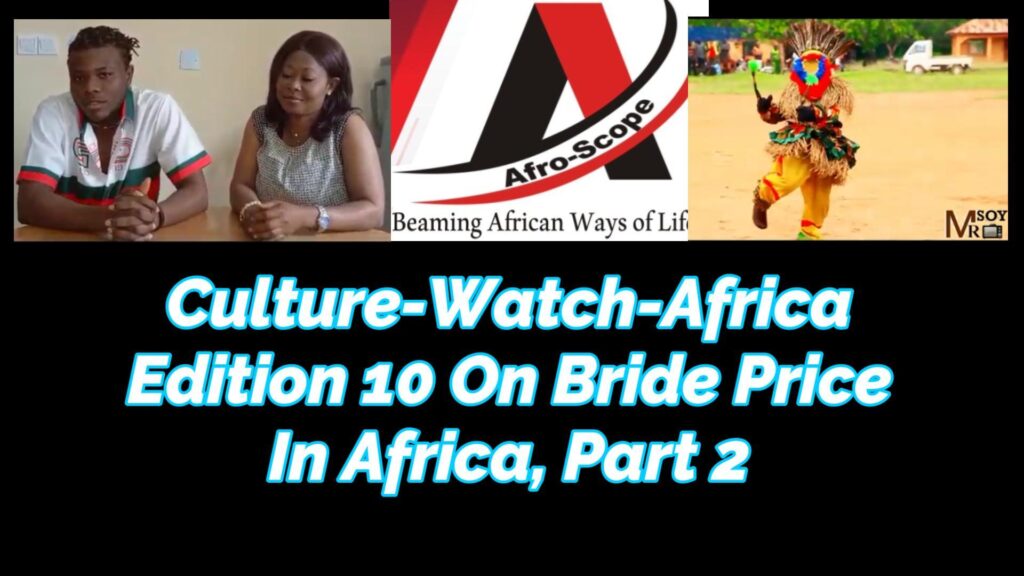 January 21, 2024 Afro-Scope Presents: (1) COMPARISON OF BRIDE PRICE TRADITIONS OF THE TIV & IGALA TRIBES (2) PLUS THE TALLEST MASQUERADE IN THE WORLD, OR, IS IT? Greetings! Today on Culture-Watch-Africa series on Afro-Scope, we bring you part 2 of our conversation on Bride Price in Africa. Part 1 in 2023 started with the … Continue reading CULTURE-WATCH-AFRICA 10 FEATURING BRIDE PRICE IN AFRICA, 2