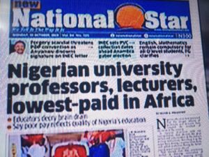 The above analogy is exactly the case with Nigerian UNIVERSITY LECTURERS (or the hard-working monkeys) and our so-called LAWMAKERS (or the lazy and corrupt baboons). The lecturers, or generally our educators, work all year round to build the nation by building our young students. And, as shown in the caption of today’s (October 20, 2025) newspaper headline below, those educators are the lowest paid in Africa, perhaps even in the entire world. On the other hand, Nigeria’s national lootmakers who are called lawmakers (the lazy baboons), spend less than one third of a year in office. The rest of the time, they are on vacation around the world with their mistresses, squandering public funds in the name of allowances. And even when they are in session at the National Assembly, they are busy plotting how to PAD BUDGETS to steal funds, how to extort bribes as they perform their OVERSIGHT FUNCTIONS, and how to steal funds in the fraudulent name of CONSTITUENCY PROJECTS.