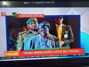 Now, you must ask why I am laughing, right? Of course, you must. Below is a photograph showing Nigeria President Bola Ahmed Tinubu speaking. He was addressing people in a conference hall yesterday the 17th of November 2025. I took the picture off a television set this morning during a news report. You can see the caption on the photo, which says that Tinubu admonished judicial judges of Nigeria to stop selling justice in Nigeria to highest financial bidders.