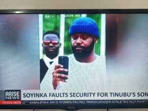 Headlines two and three show pictures of Nobel Laureate Wole Soyinka, and President Tinubu’s son, Seyi Tinubu, respectively. The captions on the pictures talk about Soyinka’s condemnation of the fact that President Tinubu is not leading ( better called RULING) by example. Tinubu’s son Seyi moves about with almost a whole battalion of soldiers, not even ordinary police officers.